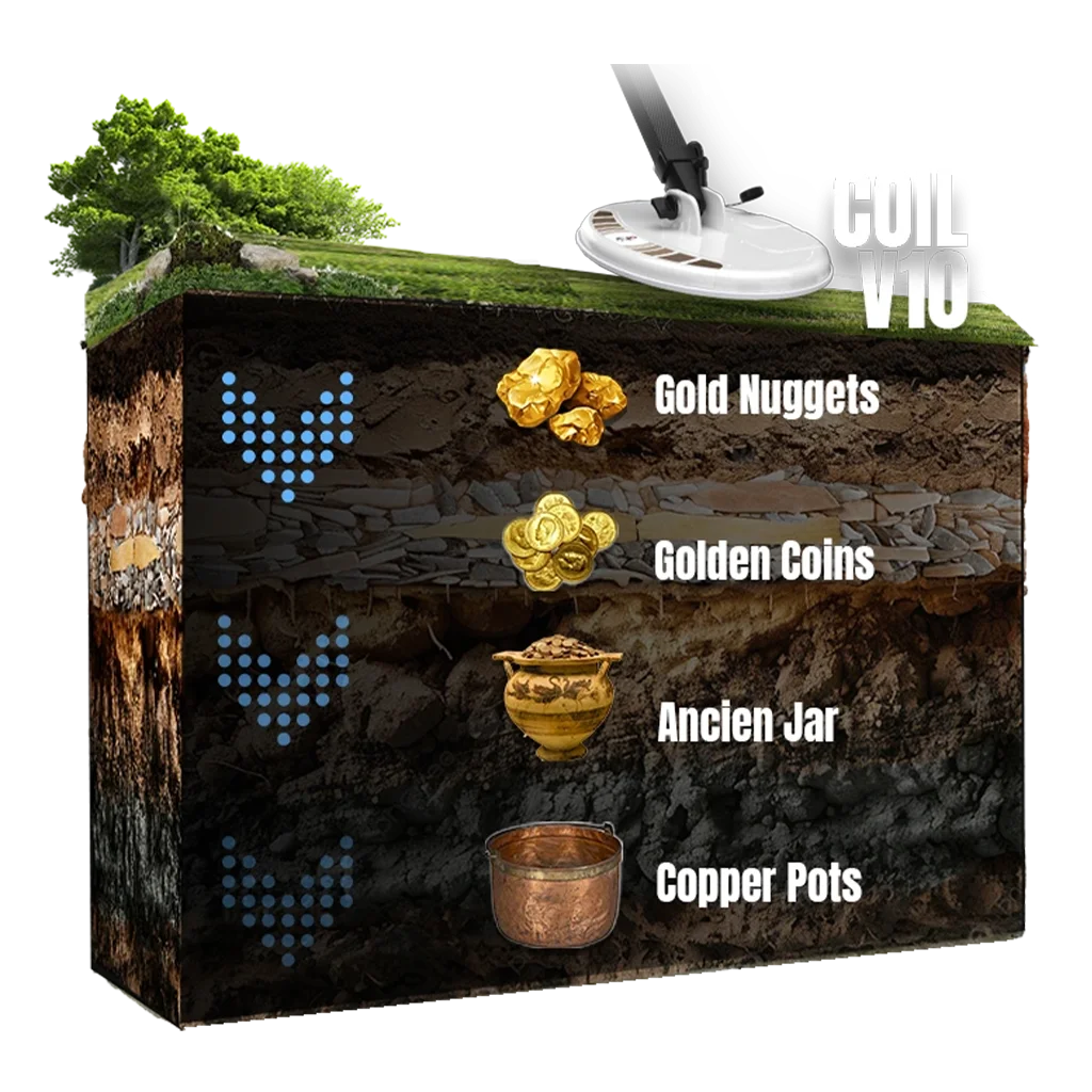 O Vitran VX10 está equipado com uma bobina V10 de alta sensibilidade, projetada para detectar alvos pequenos e médios com alta precisão e capacidade de resposta.